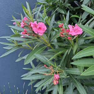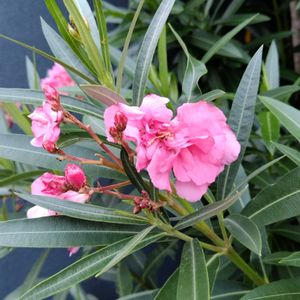 キョウチクトウ(夾竹桃) キョウチクトウ科キョウチクトウ属 常緑低木 暑い時期に元気をくれます🌸😃 他の花がぐったりしている 近所の団地の花壇で 今、一番元気なお花です🌸🌳 地中海沿岸、中東、南アジア原産だったんですね🌸 古くから、乾燥する暑い地域で親しまれた歴史があるようです 基本種はピンクの一重だそうです🌸 乾燥、大気汚染、潮風にも強く公園や街路樹に植えられています🌸🌳