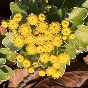 今日のお花 🌱イソギク(磯菊)🌱 千葉県〜愛知県の海岸沿いの崖や岩場に自生するキク科の植物だそうです。 我が家のイソギクは10年前位に友人から一苗貰ったのが沢山増えました。 花びらのないポンポンとした丸い黄色の可愛い花で、葉の白い縁取りが魅力的です。 白っぽくみえる縁取りは、葉裏の銀葉がまわりこんで見えるものです。 花がなくても葉っぱだけでも素敵です♡♡ ❶ 今朝9時撮影です。 ❷〜➎ 11月4日 12日 22日 撮影です。 我が家の庭にて。