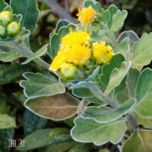 おはようございます☀️🙋♀️ 磯菊🌸きく科 花言葉 感謝、清楚な美しさ、大切に思う、静かな喜び 葉🌱に白い縁取りがあり、 花びらが無く密ですねぇ🍀