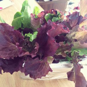 ベランダ菜園はじめての収穫✨ 間引きを兼ねたミックスレタス・水菜の収穫と、再生野菜の人参の葉 昼食に添えました♪