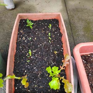 ダイソーで買ったレタスミックス(種50円)、種まきのときに別の植物の根元にいって立派に育ったレタスや込み合ったレタスを避難させて寄せ植えしました(*^^*)