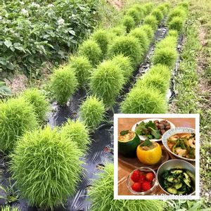 ホウキ🧹材料用の畑のコキア、もふもふ感が増してきた😊。夕食は、丸型ズッキーニ🍈の肉詰め、ブロッコリー🥦とイカの炒め煮、キュウリ🥒とピーマン🫑の塩昆布和えなど🤤。食卓がカラフルだね〜^_^。