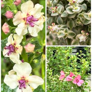 バーバスカム・サザンチャーム💕✨ 夏越しして咲いてくれました♪ «٩(*´ ꒳ `*)۶»ヤッター✿︎ ジギタリスの葉っぱかなぁと思っていたら可愛いお花が🌸 めっちゃ嬉しい☺️ ②はピンクノウゼンカズラ🩷 淡いピンクとコラボならずでしたが去年植えた苗が大きく育って沢山咲きました🌸 近くで見ると結構濃いので遠目で見ると良い感じ👌