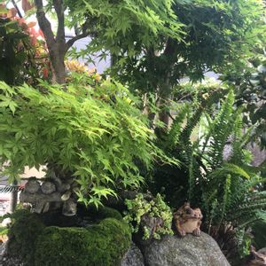 初夏、紅葉の緑が綺麗です。 花も咲いています。 つくばいに落ちる水の口には母が小鳥の置物をこっそり置いています。 小鳥が大好きな我が家です。