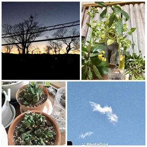 ユーフォルビア・ソテツキリン🦒𓂃𓃱𓈒𓏸 軒下に置きっぱなし😬 気が付いたら小さなお花が咲いてましたꕤ*。゚😳 夕方の空と雲 薄いですが彩雲かも🌈 🏷雲仲間