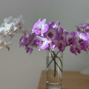 💐切花を飾る💐 胡蝶蘭なごり雪❄️とミニデンファレを一緒に ①切花 ②〜④原種胡蝶蘭を全密閉で養生中 植え替えたら葉がシワシワに💦 気孔が開く夜間だけビニールを被せて息を吹き込んでいましたが、100均で大きめの食品コンテナを見つけました☺️ 葉のしわは徐々に回復❤️🩹 リンデニーの蕾はシケた⤵️😭