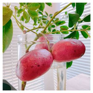 ムベ 「アケビの仲間みたいだけどなんだろうね〜」と名前が分からないまま社内に飾られてました😅 今日テレビで紹介されていて「ムベ」だと知りました!(たぶんムベのはず) 滋賀県で栽培されていて、不老長寿の実といわれているそうです🤤 アケビと違って熟しても実は割れないみたい〜