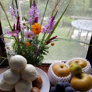 今日はお月見饅頭を作りました🎑 河原ですすきを取って来て🌾庭の花と一緒に飾りました💠🍐🍇