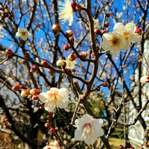 おはようございます🙋♀️ ①梅の花 ②③茶ノ木 ④ビワの花 ⑤ローバイ 🏷️木曜日は木に咲く花 🏷️小春日和の散歩道 🏷️春の訪れ 昨日の散歩道🚶♀️ 青空が美しい気持ちの良い日中の散歩道で出会った木に咲くお花達をコラージュ🎶💓😍