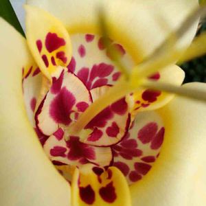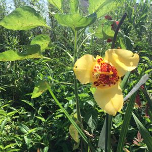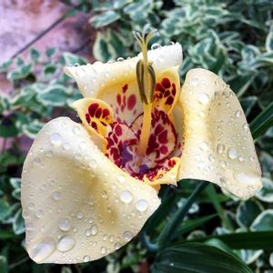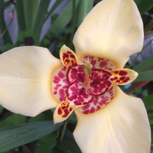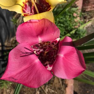 ✨チグリジア✨ 大きな花びらが3枚✨ 朝 6時30分はまだ開いてなかったのに 7時に開いてた👀 朝 開いて夕方しぼんで終わりの1日花💠 先日、オレンジが咲いたけど、気が付いたのが遅くて写真撮影できなかった💦 選りに選って こんな雨の日に咲かなくていいのにね😅