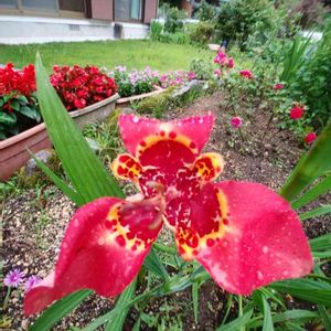 咲きました 教えて頂きましたら『チグリジア』でした! タグは「チグリシア」になってます…なんでだろ🤔 生協の球根セットを買ってポコポコ植えて名前のを捨ててしまってました〜🙃ダメダメデスネ💧