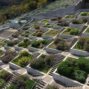 キク科の植物 淡路夢舞台 百段苑(ひゃくだんえん) この大花壇は🌼山の斜面に沿って4.5✕4.5mの花壇が🌼階段状に100個集まってできている庭園で🌼 安藤忠雄氏が阪神淡路大震災被災者への「祈りの庭」として設計されたものです🙏 ここに植えられているのはすべて“キク科植物”で🌼約100種類あります🤗 キク科植物は地球上のあらゆる場所に生育し🌼その数は種子植物の中で最大の約2万3千種です🌼 兵庫県淡路市夢舞台"百段苑"