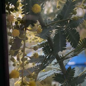 見えますか〜💦ちょっと見えにくいかな〜😅😆🤣🤣🤣 銀葉アカシア💛𓈒𓏸 外は庭に雪❄がまだまだ残っていて今日の最高気温は2度🥶 なのに窓ガラスに触れているミモザ咲いていた〜💦今日気づいた〜💦🤭 リビングから撮影📸