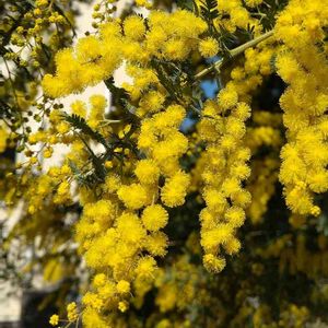 銀葉アカシア(ギンヨウアカシア) マメ科アカシア属の常緑小高木。オーストラリア南東部原産で明治時代末期に渡来した。銀色っぽい小葉からなる偶数羽状複葉が螺旋状につき、遠くから見ると青白く見える。花期は2~4月。黄金色の花が集まって球形になった花がさらに房状になって木全体を覆う。 日本ではアカシアの仲間を総称してミモザと呼び、その代表は本種とフサアカシアだが、英語名やフランス名のミモザはフサアカシアを指す。しかし、ミモザは本来オジギソウ属の学名である。オジギソウとフサアカシアの花や葉が似ているため、イギリス人がフランスからフサアカシアを輸入する際に誤ってミモザと読んだのが、そのまま日本に伝わったという。 出典『樹木の事典600種』『樹木の名前』