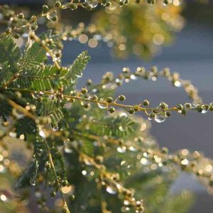 銀葉アカシアの枝に朝露 朝日が反射してキラキラ✨