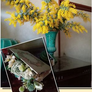 こんにちは~、今日も暖かくて、外のお仕事がはかどります😊🎶🎶 2回目のミモザの✂をしました、今度は花瓶にに入れ、暫くはフワフワのお花を楽しみます😊💕💕 足元には先月作った、ちょっとくすんだ色のシルキーフラワーのアレンジを並べて飾りました。😊👌
