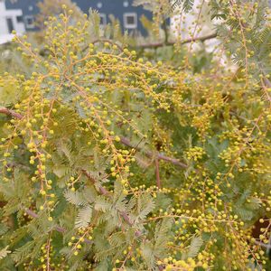 今日の花 ミモザ ギンヨウアカシア 青空でないのが残念。 思いがけない大寒波にも負けずに、今年も見事な花房。 ミモザの日の今日、満開だろうな。 3/5pic 日本でも、春を告げる花に。 路地を歩けばあちらこちらに植栽されてる。