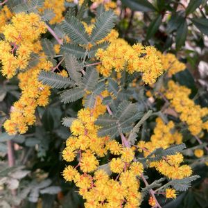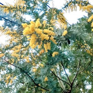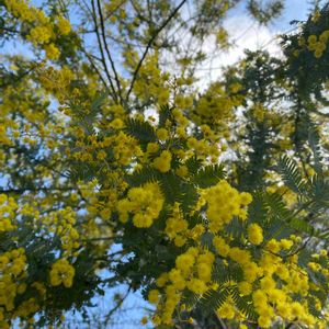 🏷今日のお花「ミモザ」✨🌼🌼🌼 青空を背景に、鮮やかな黄色の花と緑色の葉のコントラストが美しいですね✨🌼🌱 これは 銀葉アカシア でしょうか🤔 マメ科 アカシア属 全体の花言葉 は、 「感謝」「友情」「密かな愛」「エレガンス」 黄色いミモザの花言葉は、 「密かな愛」「秘密の恋」「真実の愛」 ✳︎ ミモザはマメ科 アカシア属の総称。銀葉アカシア や フサアカシア がよく見かけられる。銀葉アカシア は銀白色を帯びた葉を持ち公園樹などに利用されている。フサアカシア は葉が緑色で葉と花序が長くミモザ の名で知られている。どちらも樹高が5m以上になる🧐