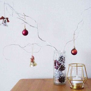 家にあるグッズで、ダイニングテーブルを クリスマス仕様🎄にしました!ガラス瓶に松ぼっくりを詰め込み、実家から持ってきたシルバーに染められた小枝をツリーに見立てて飾る。あとはバランスよくオーナメントを吊り下げて完成🙌🏻 家にあるものを組み合わせて、極細のクリスマスツリーに仕上がりました🎄😁