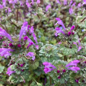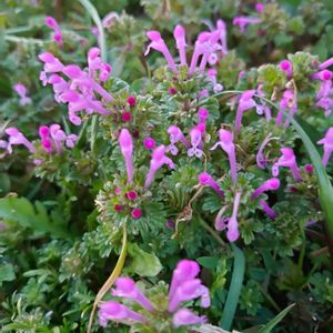 《ホトケノザ〜まるでお花畑🌸》 その葉の形が仏様の台座(蓮座)のように見えるというのが名前の由来です😃 また、葉が段状に付くところから3階建ての屋根に見立てて、「サンガイクサ」という別名を持っています🌸🌼 道端や田んぼの畦道、コンクリートの隙間など「こんなところにも?」って言いたくなるくらい、いろんなところに生えていますね😃