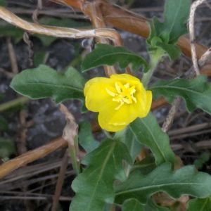 お出かけ先の堺の道端で ①キバナヒルザキツキミソウ アカバナ科 マツヨイグサ属 かな? ②ホトケノザ シソ科 オドリコソウ属 花期は3〜6月のはず。