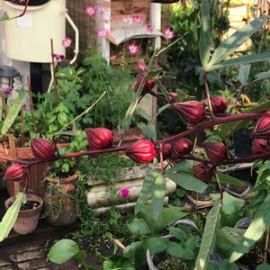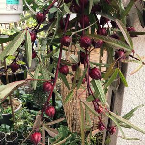 ローゼル(ハイビスカスティー) 収穫です。 実は乾燥させ 種子を取りにぞき 萼はハーブティーにします。 葉っぱと茎は 染めの材料にします。