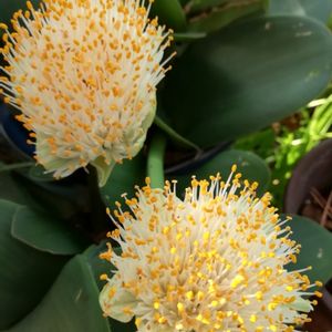 🍀🤍💛マユハケオモト💛🤍🍀 (眉刷毛万年青) 別名 ハエマンサス ヒガンバナ科ハエマンサス属の顕化植物 葉は「象の舌」「象の耳」 花は「シェービングブラシ」「絵筆」 と呼ばれている