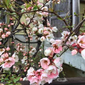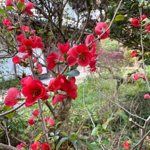 庭のボケの花が咲いています。 今日は風が強いけれど、生暖かい。