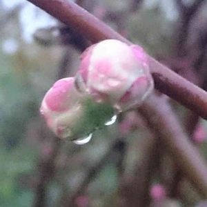 おはようございます。 冬に戻ったような朝ですね。 雫をまとったピンクの蕾 赤ばっかりになったと思ってたら、ピンクの木瓜が残ってました。