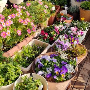 おはよう〜ございます(#^.^#)☀ 今朝は暖かくて、お花さん達もたくさん咲いてくれてました。 そろそろ、ギボウシ🌱の芽も発見💕めちゃくちゃ賑やかになりそうなんだけど、少し断捨離しようかと…小さな鉢は処分😁 花友さんからのものを大きな鉢へ引っ越ししたり、こぼれ種からのものを集めて寄植えに🌿🎶 パンジーの間からチューリップ🌷の頭も見えてきました。 お天気がいいと、テンションアゲアゲ😅忙しいわ〜💕