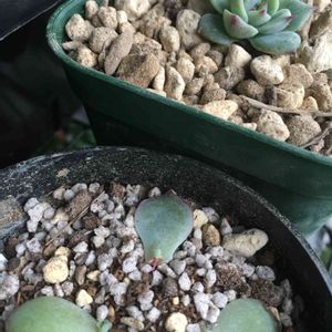 チビの桃太郎ちゃんから落としてた葉を、土の上に並べてました。 😘先ほど小さな芽や根っこが出てるのを確認💕 すごいっ✨ 親は直径3センチくらいなんですけどね〜