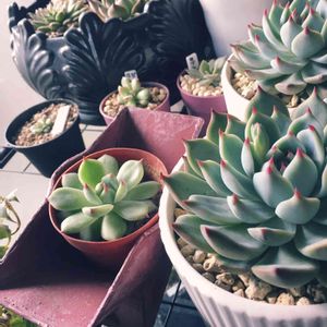 エケベリア桃太郎ちゃん6号と7号。 白い陶器の鉢に植えました。 (^^;百均だけどね… やっぱ、株が大きいと見栄えも凄いですね〜💙