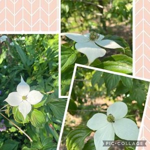 ヤマボウシ 真っ白のお花が綺麗🤍🤍 本当は枝いっぱいに真っ白になるのだけど😅 私が適当な剪定で チラホラのお花が咲きました😳 イベーと枝垂れ梅の間なので混み合ってヤマボウシさんに小さくなってもらいました🤣 咲いてくれて良かった