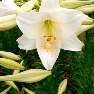 おはようございます🎵 1️⃣、2️⃣我が家の畑の鉄砲百合が咲き始めました😍‼️ とてもいい香りが漂ってます💕 後ろには雲仙岳も霞んで見えます⛰️ 3️⃣、4️⃣透かし百合! 鉄砲百合に押されてあまり目立ちませんが、こちらもポチポチと咲き始めました🎵 5️⃣百合を職場に持って行くと主人が嫌がるかと思いましたが、今年は職場が閉院最後なので、主人に断って百合を持っていったら、フルーツ詰め合わせを余計いただいて申し訳なかったです😓 夜にさっそくさくらんぼ🍒いただきました🥰‼️