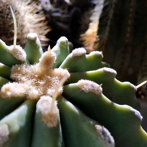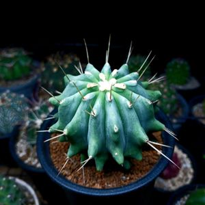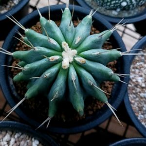 フェロカクタス棘無王冠竜。 まだ棘があるから棘有棘無王冠竜?🤣🤣🤣 そんな虫がいたっけ。 トゲアリトゲナシトゲトゲ🪳🤣ケッキョクドッチヤネン それはさておき。 ブルームに覆われた青っちろいお姿、暑さの中でも涼しげに見えます🧊 よくよく見てたら、てっぺんのアレオーレのひとつがじんわり濡れているではないか。指で触れたらベタっとした。 おぉ~、ひょっとしてこれが噂のフェロカクタスの蜜!?こんなに小さいうちから蜜を分泌するとは思わなかった。 で、日本みたいな高温多湿の環境下では、この蜜を含んだアレオーレがカビて黒くなるって話は聞いていました。それを防ぐには? 調べたら、アルコールを含ませたもの…綿棒とか?で拭いてやるといいらしい。万一カビて黒くなっても、この方法でキレイにすることは簡単だそう。 覚えておきましょうφ(..)