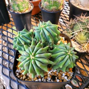 親子サボテン 鉢がキツキツになってきたので植え替え😋 ①before ②頭に乗せてるお子様たち👶🏼🔍 ③after ④愛想に石なんか置いてみたり🪨🤭 ⑤過去の投稿 すごくデカなったでしょ?(⑉・ ・⑉) 植え替えたけど 鉢の大きさあんま変わってなかった _( :⁍ 」 )_アレェーーー まあ、土を新しくしたということで( ¯꒳¯ ) 🏷️へぴょんの親子サボテン フェロカクタス属 棘無王冠竜