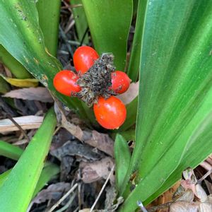 落ち葉に埋もれているおもとの実です😊 ミニトマトぐらいの大きさになっていて ビックリ‼️放置状態ですが育ってくれ 嬉しいです🥰