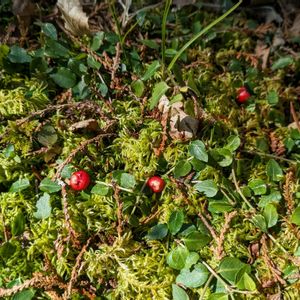 阿寺渓谷にバイカオウレンを見に行った時にありました。赤い実が落ちているのかと思ったら、地面にくっつくように生えていました。