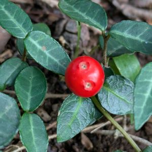 ツルアリドオシ 「千両 万両 有り通し」 お金がいつもある♫目出度い!ということで、アリドオシは一両🧧 そのアリドオシに花も葉も実も似ていて、ツル性なのがツルアリドオシで、一応 目出度い♫ 赤い実には花の萼片の痕が2つの穴として残っている⭕(2、3枚目) 茎に鋭い棘を持ち、「小さなアリでも刺し貫く」というのがアリドオシが一両と名付けられた由来の一つらしく 本来の意味からすると棘のないツルアリドオシは一両ではないのですけれど🔴(´•᎑•`)(1、4枚目)