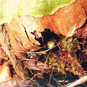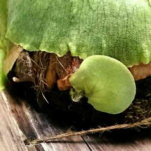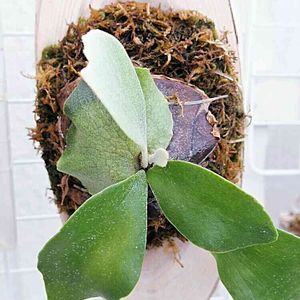 今年の不定芽の初めての貯水葉がおおよそ完成した模様 縦横 3×2センチの小さな貯水葉です 去年の不定芽が 親株の購入時のサイズとほぼ同程度且つ、胞子葉1枚目展開中なのでこれから3年かけて大きくなるとすると… 不定芽からほぼ成体まで4年 しかし親のパッチまだ見てないのがなぁ… 標本個体まで後少しだと思うんだけど