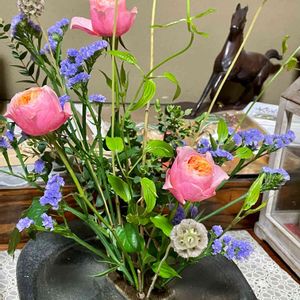 薔薇 スカピオサシード スターチス ユーカリ お花屋さんに生花の花材を買いに行ったのですが、枝物が入荷なくマイガーデンからプラスして、洋風生花になりました。 蔓系の葉物の名前…思い出せない(笑) 短く切ったバラは、挿木にして次なるスカピオサ楽しみにしています♪
