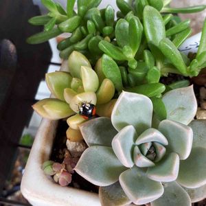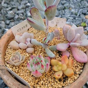 不思議な多肉鉢 同じ土を入れて寄せ植しましたが、中心のブロンズ姫を境に、育ち方に大差が⁉️ 左半分のヌビゲナム、おうれい、ピンクプリティは、グングン大きくなりました。ところが右半分がダメなんです。最初に植えてたエケべリアサブセリシスが萎縮し始めたので(これは時期的な現象?)避難させました。ほっといても大きくなるはずの、姫秋麗も育たず😵💦一度バラバラになり、今の2代目もはかなげ。リトルビューティも一度枯れてしまい今の2代目もパットしない感、レッドベリーも微妙な感ですね。何だか根っこが機能してない印象です。 何が悪いのでしょう?と日々模索中。