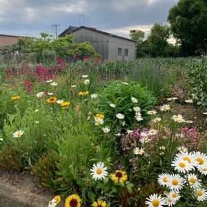 おはようございます😃 今朝は曇天です。 散歩途中の楽しいお花畑です。 住宅街に残る小さな畑、ネギなど少しばかりの野菜の他に、たくさんの花が植えられています。 マーガレットやヤグルマギク、懐かしい花です。 早咲きのグラジオラス、ビザンティヌスでしょうか。 花が切られる様子もありません。🤔 近くにお寺もあります。 墓参りに利用したり、自宅で飾るのでしょう。😊 こんな畑の隅の花壇がとても好きです。