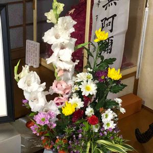 菊の花だけ 購入しました。自作の 初盆飾り🤗 表装する 間がなく 自作の書😅 一周忌までには ちゃんと軸装出来る様 頑張って書きます💪
