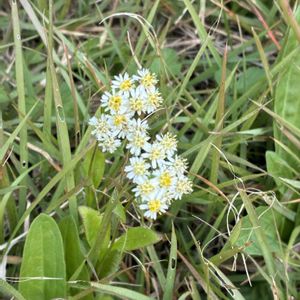 【キッコウハグマ(亀甲白熊)】 日本・朝鮮半島原産、キク科多年草 本州~九州の山地のやや乾いた木かげに生える。 茎先に総状または複総状花序を出し、頭花をつける。 頭花は3個の小花からなり、花冠は白色で長さ9mmほど。先はそれぞれが5深裂するので、15個の花弁と3個の雌しべを持つ一つの花のように見え、花弁が風車状によじれる。 葉の形を亀甲、花を白熊に例えた。 草丈:10~20cm 開花時期:9月~11月 花色:白 秋吉台@美祢市