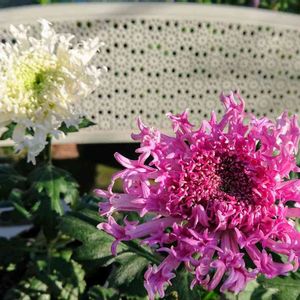 いつもの花屋さんで花びらに特徴のある菊を発見 愛知県生まれのキク新品種 かがり弁 フリルのような花びらが特徴的な美しい花 ジャパンフラワーセレクションでベストフラワー賞を受賞 この秋 初登場 このお花の置いてある場所に写真付きでコメントが記載してあるのを写して来ましたღ 黄色も蕾の状態で有ったのでお迎えして😊🎶 大きめの鉢に3株まとめて寄せ植えにしちゃいました✨