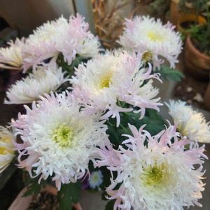 ポットマム かがり弁💚 久々の投稿です。 外に出していたら、真っ白からほんのりピンクに… 寒い中、とっても素敵に咲いてくれています😊
