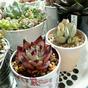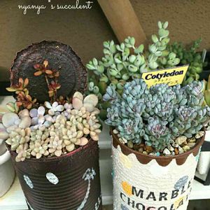 右 かわいいリメ缶にブルービーン植え替えしました❗ 左 Nomachan のsmile缶は手直ししてだるま秀麗の葉挿しっ子を入れました❗うまく育って欲しい😳