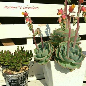 昨日撮ったものですが、ライム&チリ 親も子も同じ大きさです。 花芽がかわいいよ💖 後ろの円盤みたいなの気になるでしょ? 円盤4ついるんだよ😆
