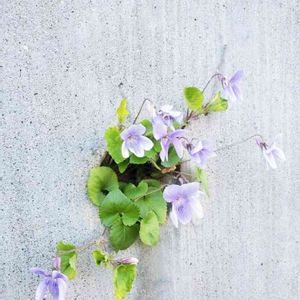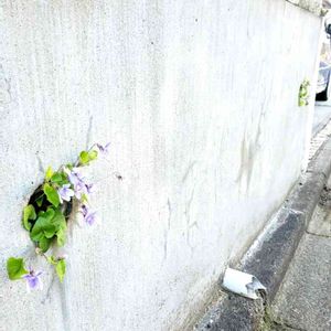 昨夜の暴風雨から一夜あけて🍃 被害を確認中、塀の穴に咲くスミレ発見👀 わぉ😲 ここって、排水の穴?? 奥の穴からも咲いてますよー。 強い子ですね❇